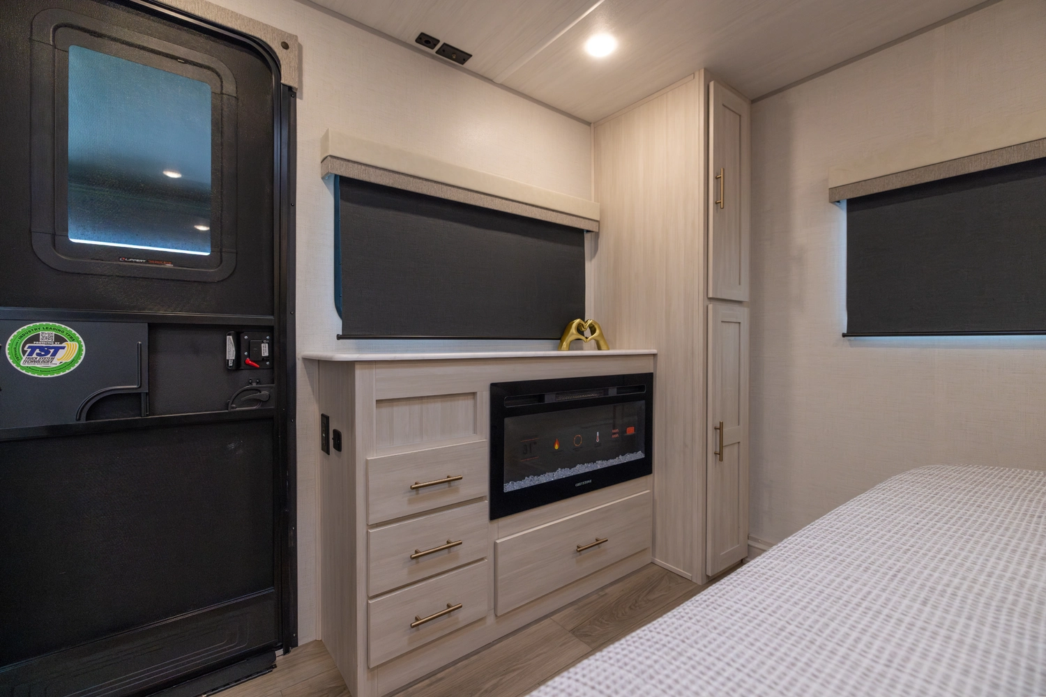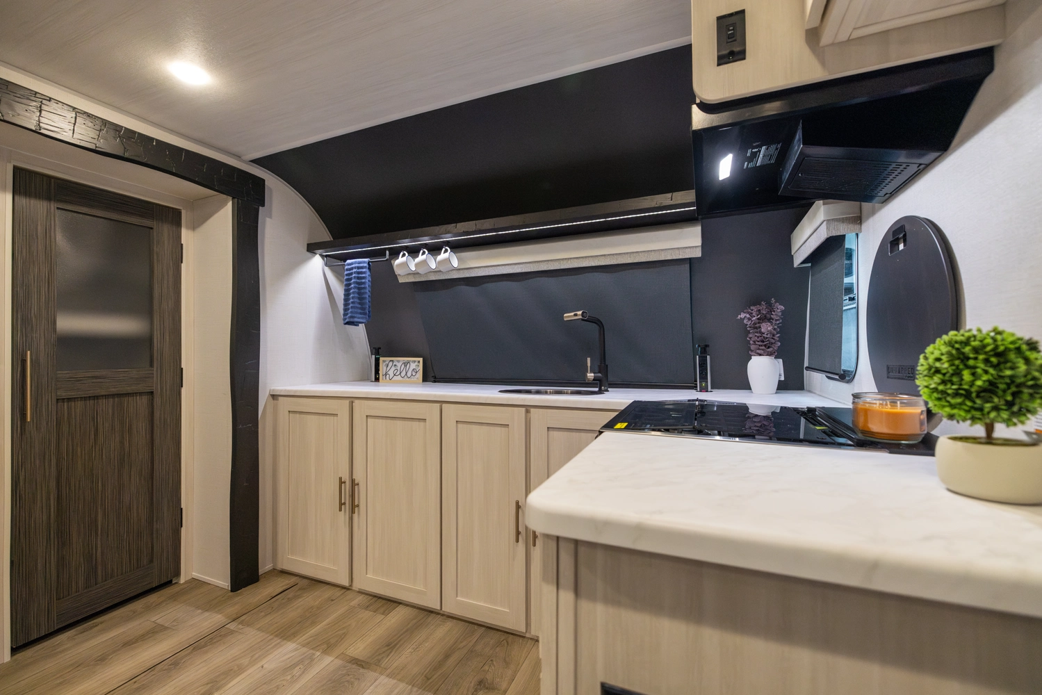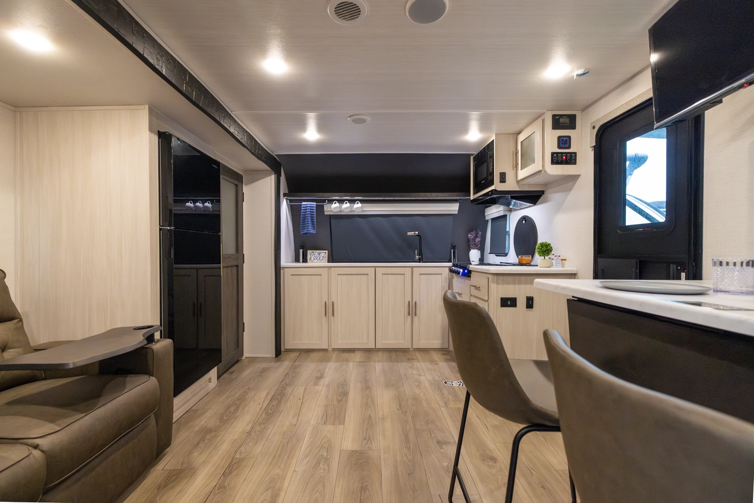 The Un•Mapped 25FK features a front kitchen with a 12V black glass refrigerator and an air fryer microwave. The Bar2Table pull-out dinette and TrailGate outdoor bar enhance dining flexibility and outdoor entertaining. Inside, enjoy a king bed, 15K A/C, and a tankless on-demand water heater. Exterior amenities include a 21' powered awning and a hot & cold spray port.