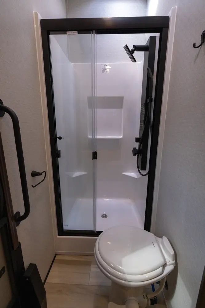 • Full 48” x 30” Rectangular Shower with Seat and Sliding Glass Doors