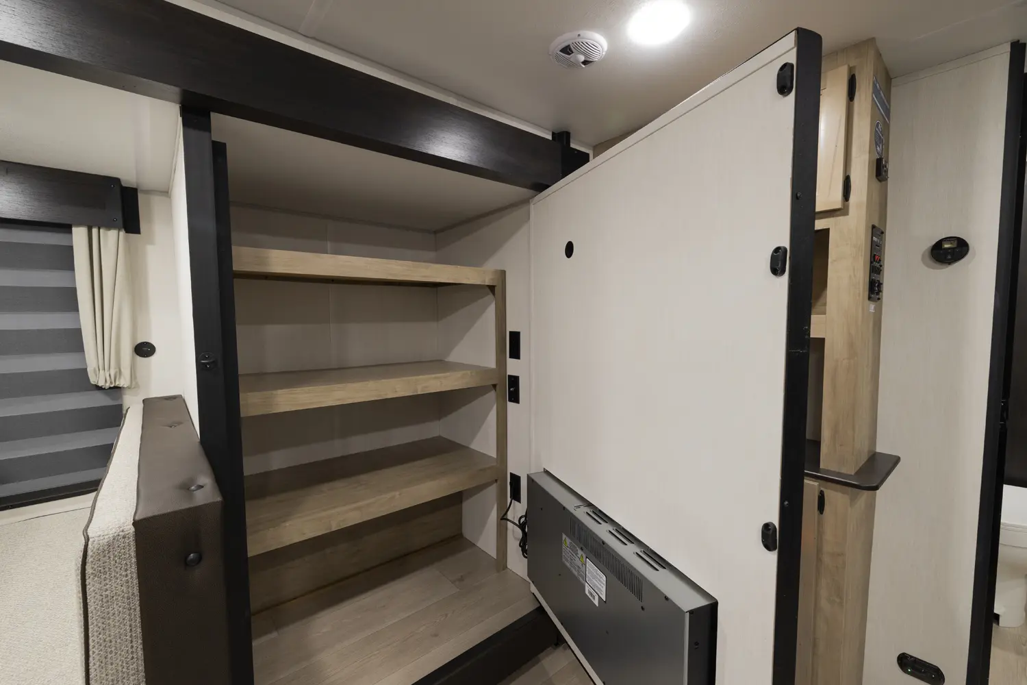 The Cherokee Grey Wolf 26SS by Forest River is a compact yet luxurious travel trailer. Its rear kitchen layout, combined with a large dinette, air fryer combo microwave, 12-volt refrigerator, and ample prep space, makes it perfect for cooking and entertaining. The spacious living area features a convertible sofa for additional sleeping and a hidden pantry for convenient storage. The primary suite, with a king-size bed and ample storage, offers a comfortable and stylish retreat.