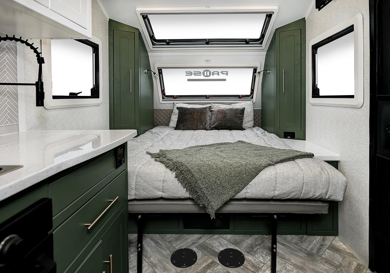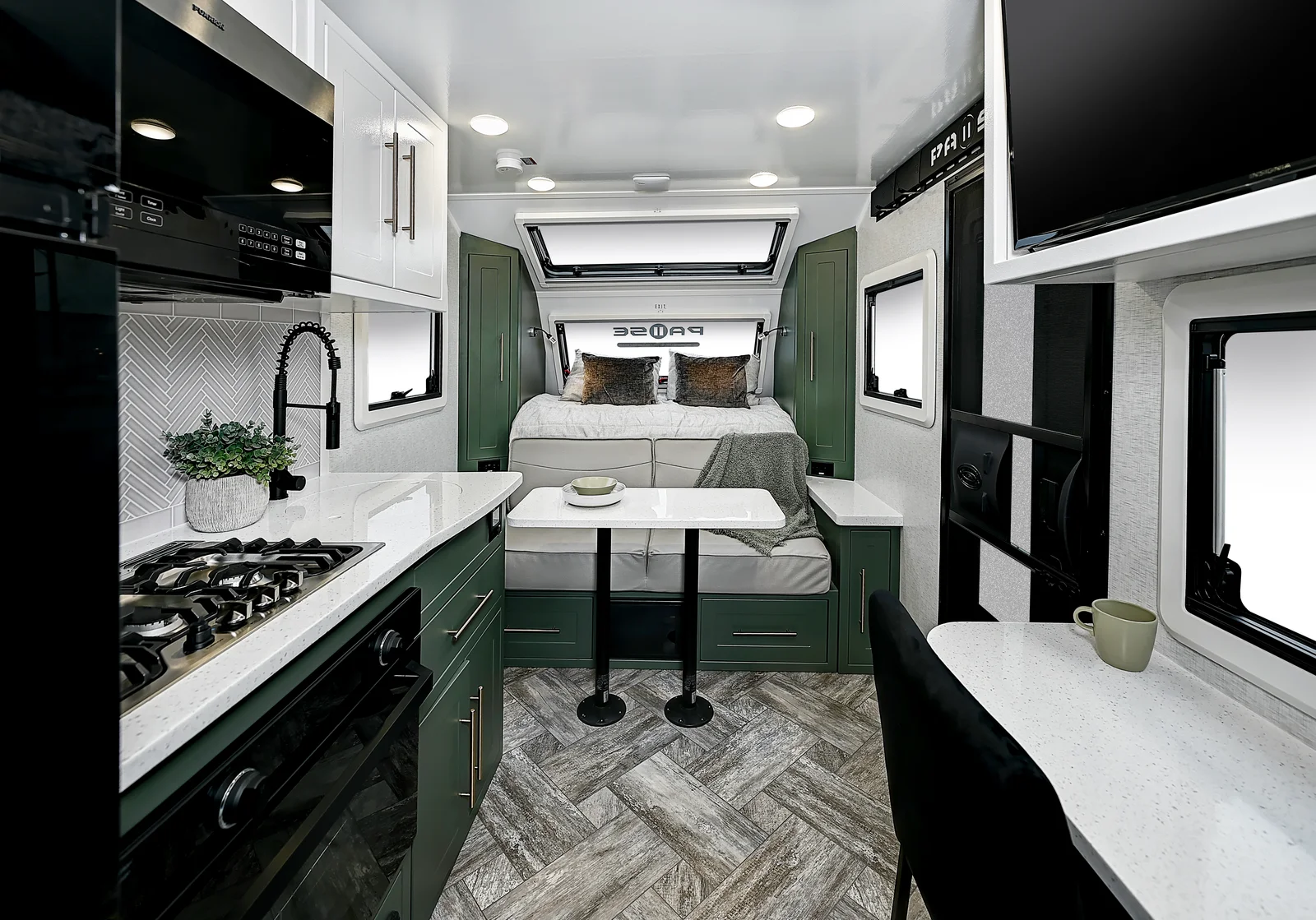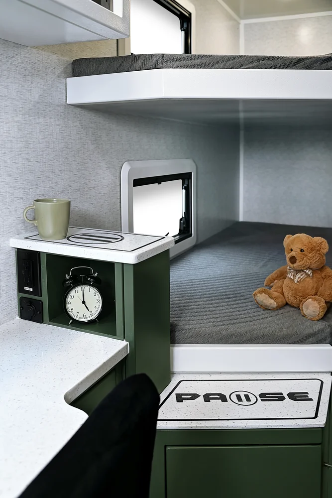 Bring the whole family along with this floorplan! A full size queen bed on the front of this trailer, along with two bunk beds in the rear grants comfortable sleeping for everyone. Make sure you get all your work done while on the road with an entertainment center and a desk below you can utilize for a work station. Cooking can be done with ease on the interior, or exterior of this floorplan. Exterior storage can be found in the rear garage and below the bottom bunk bed on the exterior.