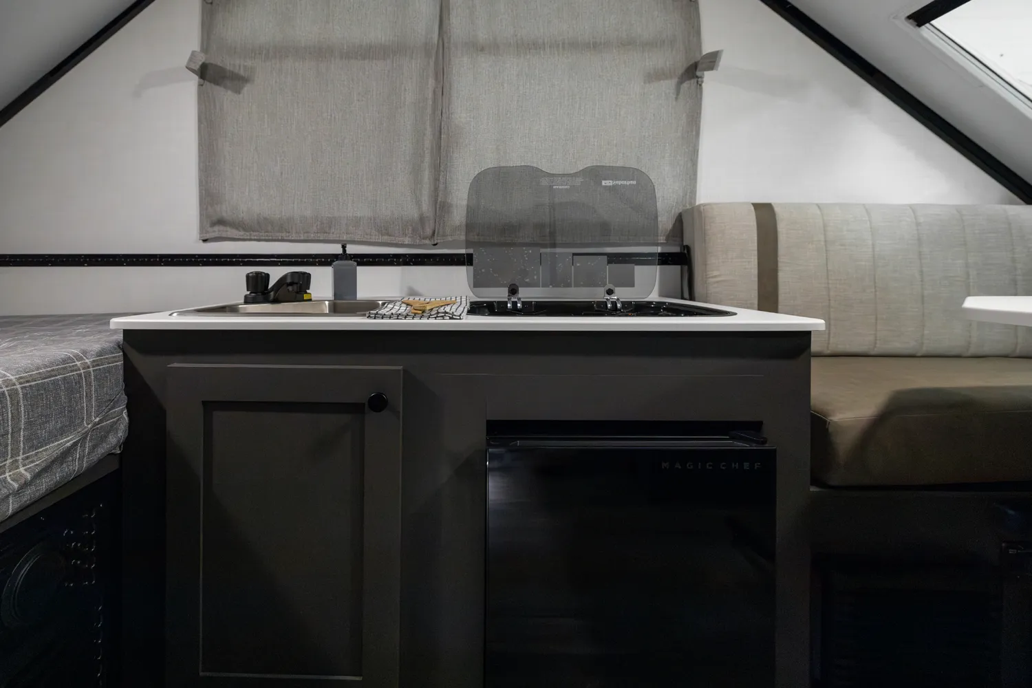 The A122S is exactly like the A122 with a large storage area on the front with all the comfort features and sets up into a firm structure in just minutes. The large window on the front side gives the dinette plenty of seating for four. If you're looking for a small A-frame camper with tons of storage, this is the camper for you.