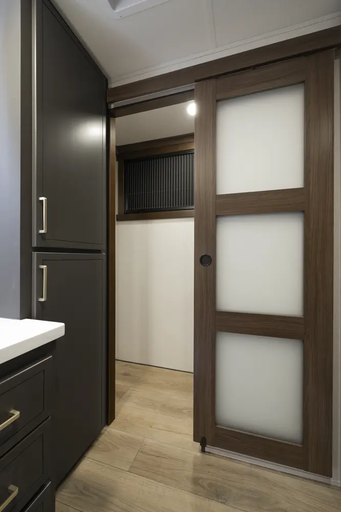 The 412FWC maximizes space with functionality. Step through the massive 38" entrance door and into the mud room, or relax on the L shape sofa and watch TV. This coach also features and area to work with a flip up desk, or an area to entertain with a wine bar. Interior features like custom cabinetry blends with modern amenities like a washer and dryer, adjustable shelves, king bed and more to provide the ultimate stay.