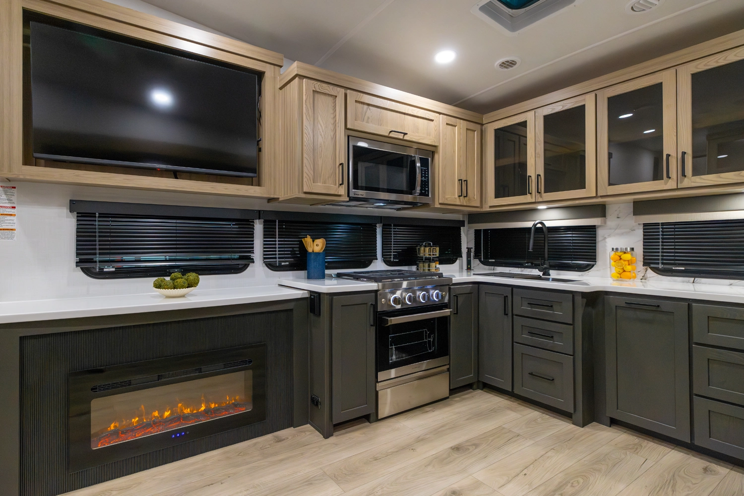 This versatile fifth wheel offers a spacious living area with a 60" hide-a-bed sofa, fireplace, and optional theater seating. The large king U-dinette converts for extra sleeping space and provides plenty of room for family meals. The front bedroom features a queen bed with an optional king upgrade and ample wardrobe storage. With a full rear kitchen, pass-thru storage, and a 21' awning, it’s designed for comfort and convenience on every trip.
