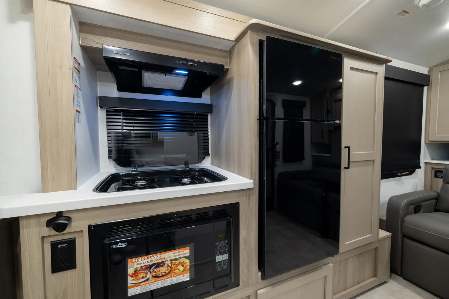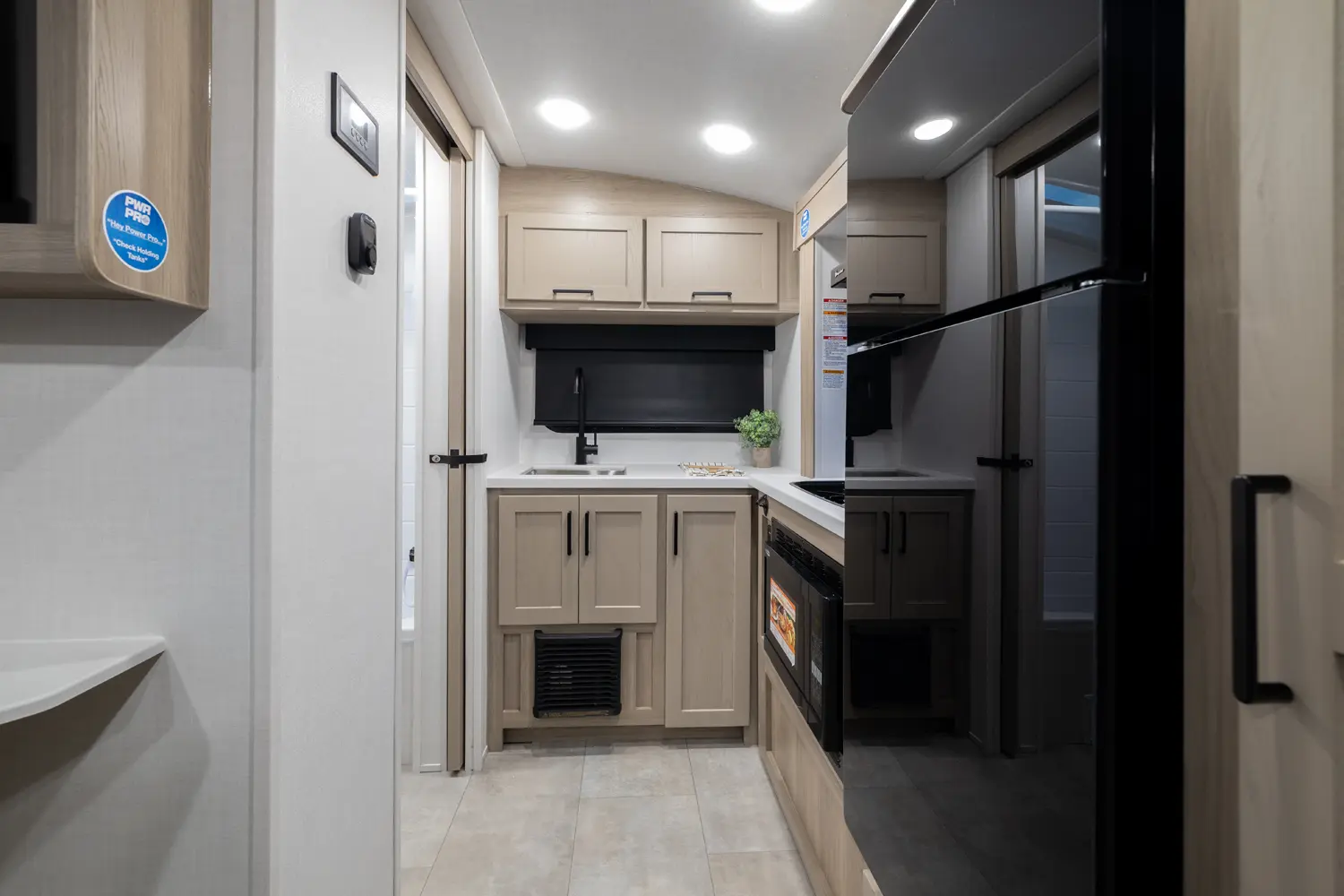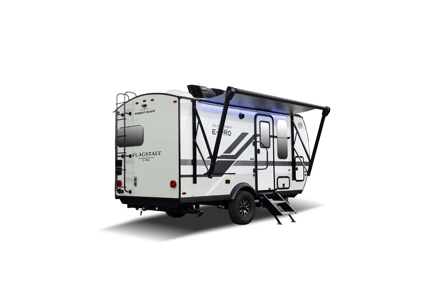 The Flagstaff E-Pro 15FBS delivers a smart, space-efficient layout and a compact, easy-to-tow trailer. The Murphy bed quickly converts into a comfortable sofa, giving you both living and sleeping space. A functional rear kitchen offers solid prep space and storage, while the large side bathroom features a squared shower providing extra comfort and room not often found in trailers this size.