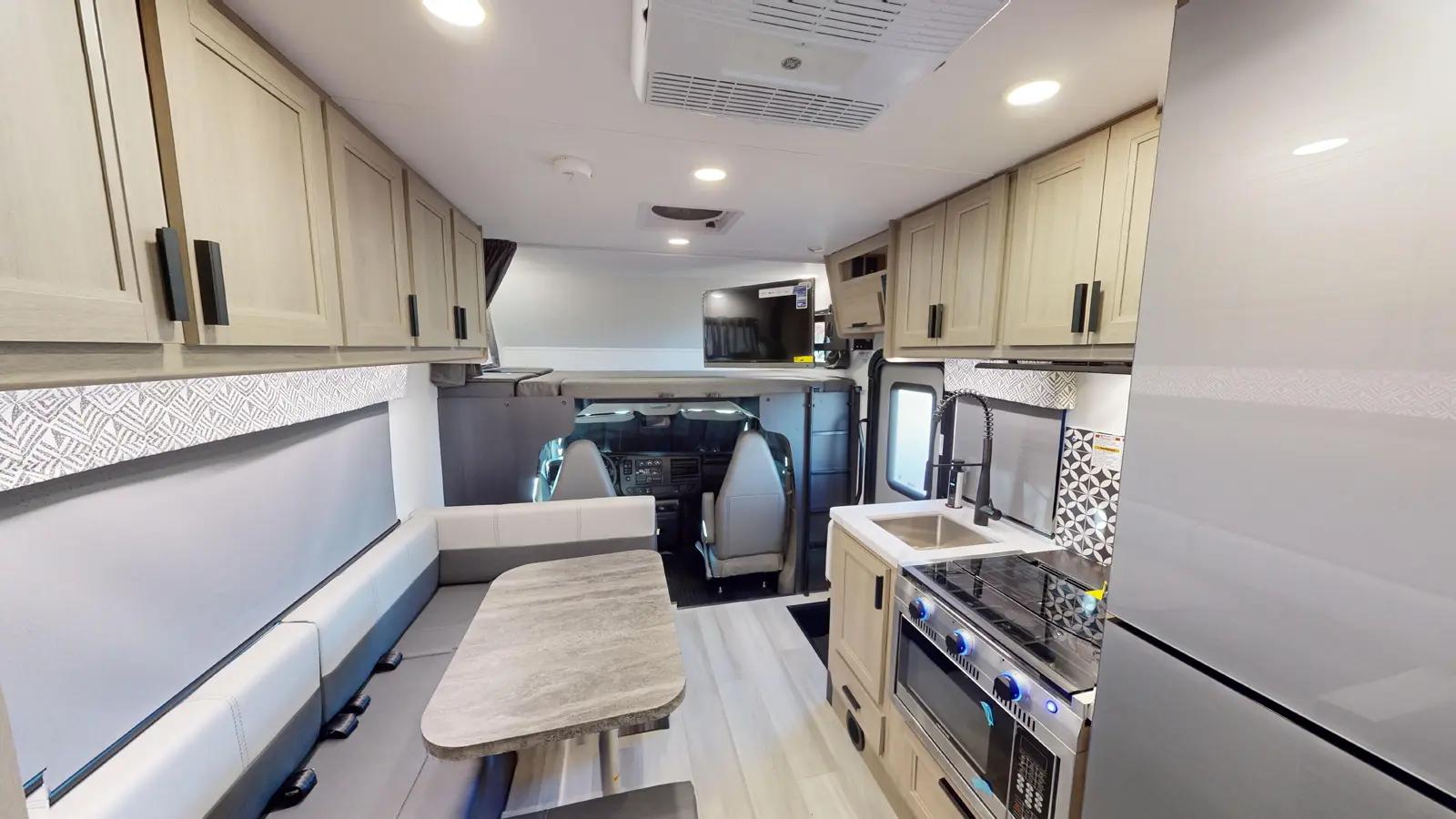The Forester 2351LE provides a queen-size cab-over bunk for sleeping space or storage, plus a rear queen bedroom. The U-dinette provides additional sleeping space. The kitchen offers a 10.7 cu. ft. 12V refrigerator, a convection microwave, a recessed three-burner range, soft touch self-closing drawer guides and a cordless 12V charging plate. The private bathroom gives you a place to get cleaned up, and the sink is just outside the door. This model is available on a Ford or Chevrolet chassis.