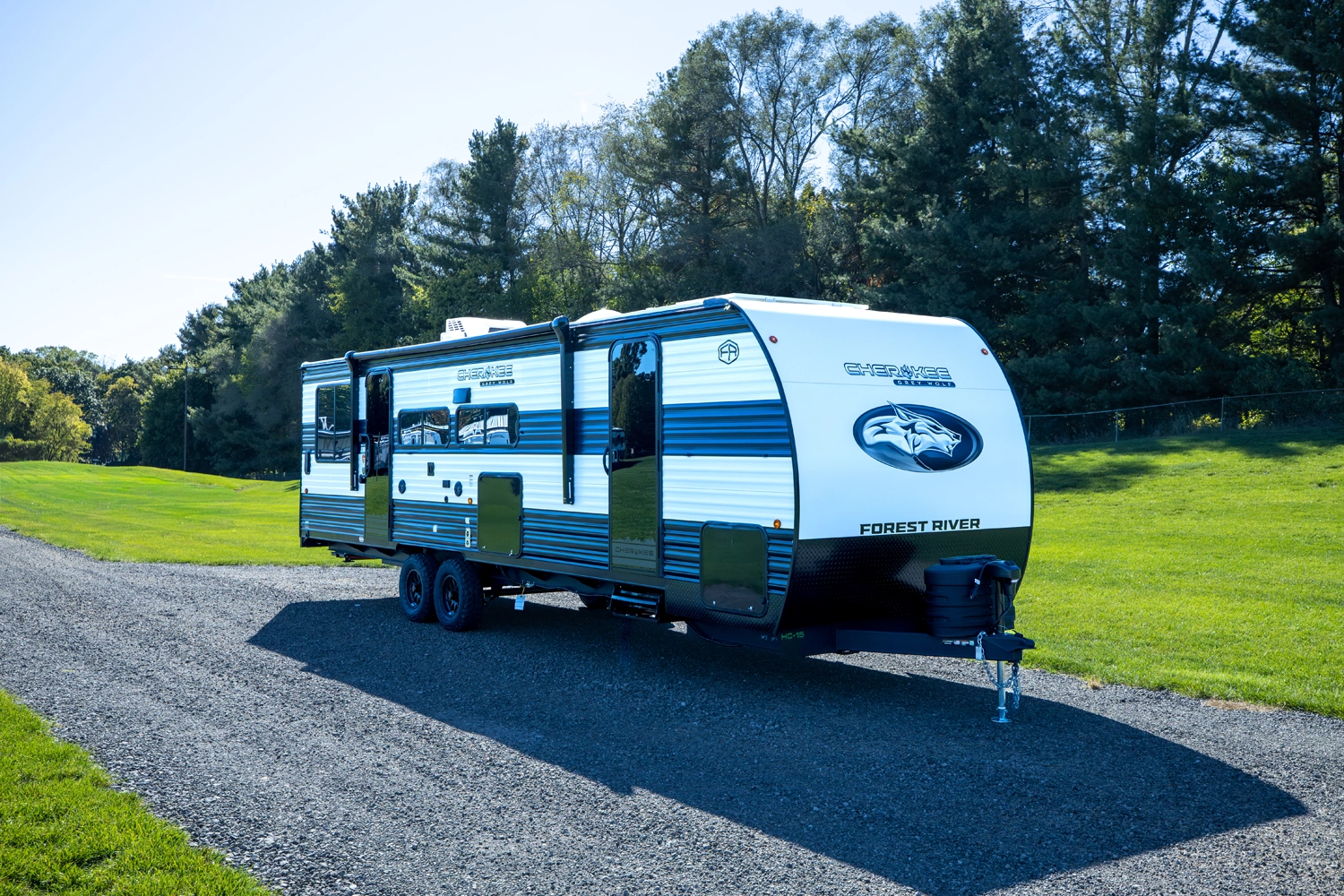 • Cherokee Black Label Grey Wolf (Deep Tinted Frameless Automotive Glass Windows, High Gloss Gel Coat Exterior Sidewalls, Multicolor Reading Lights, Pillowtop Mattress Upgrade, Power Tongue Jack, Pull Out Sprayer Faucet, Solid Surface Countertops, Thermo Foil Arctic Insulation)