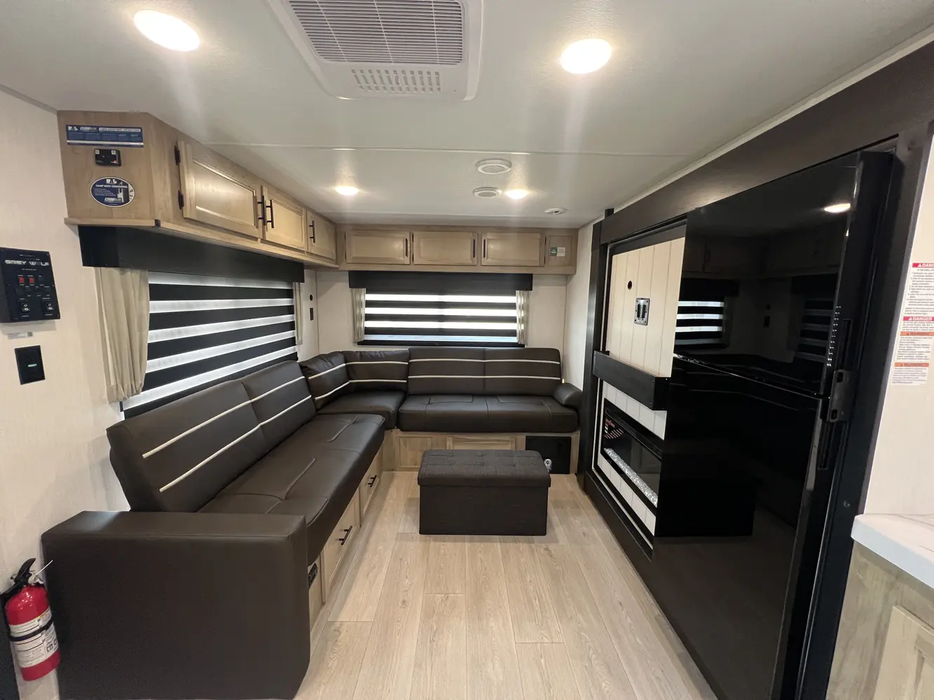 The Cherokee Grey Wolf 27LH by Forest River is a stylish and functional travel trailer with a focus on affordability, perfect for modern camping. Despite its compact 33-foot, 6-inch length, the 27LH feels incredibly spacious, thanks to its residential-style sofa and large windows that flood the interior with natural light. The bedroom is also impressive with a king size bed and plenty of wardrobe space.