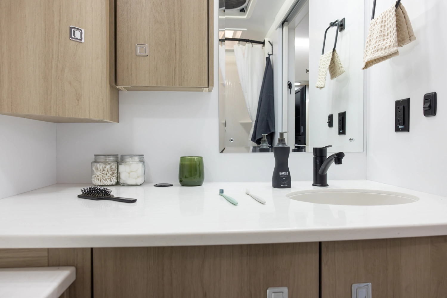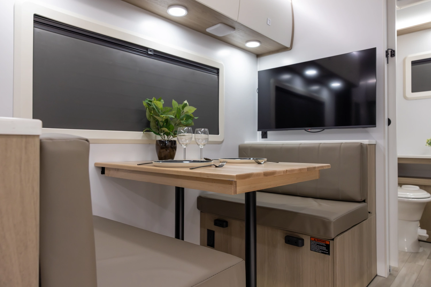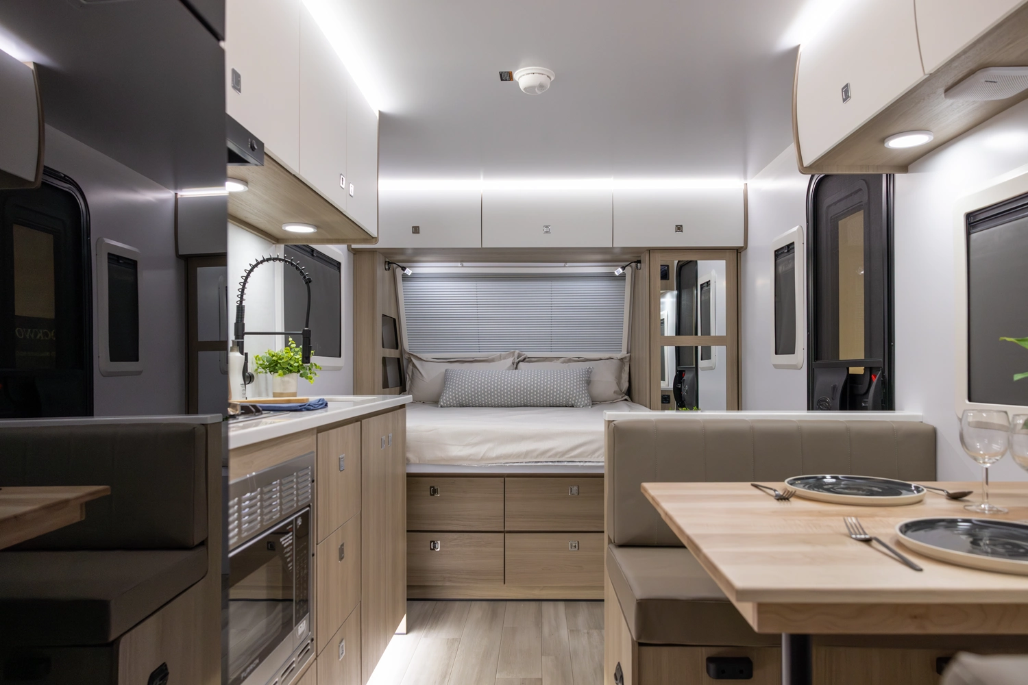 This floorplan provides all necessities without compromising space! It features a full-size queen bed, a 4-person dinette that converts to a bed, and ample bathroom counter space, ensuring comfort for everyone. The oversized passthrough storage compartment offers room for everything you need. Cooking is easy with a 3-burner cooktop, convection microwave oven, a 10.7 cu ft refrigerator, 6 cabinets, and 4 drawers. The robust solar system allows all components to operate without being plugged in.