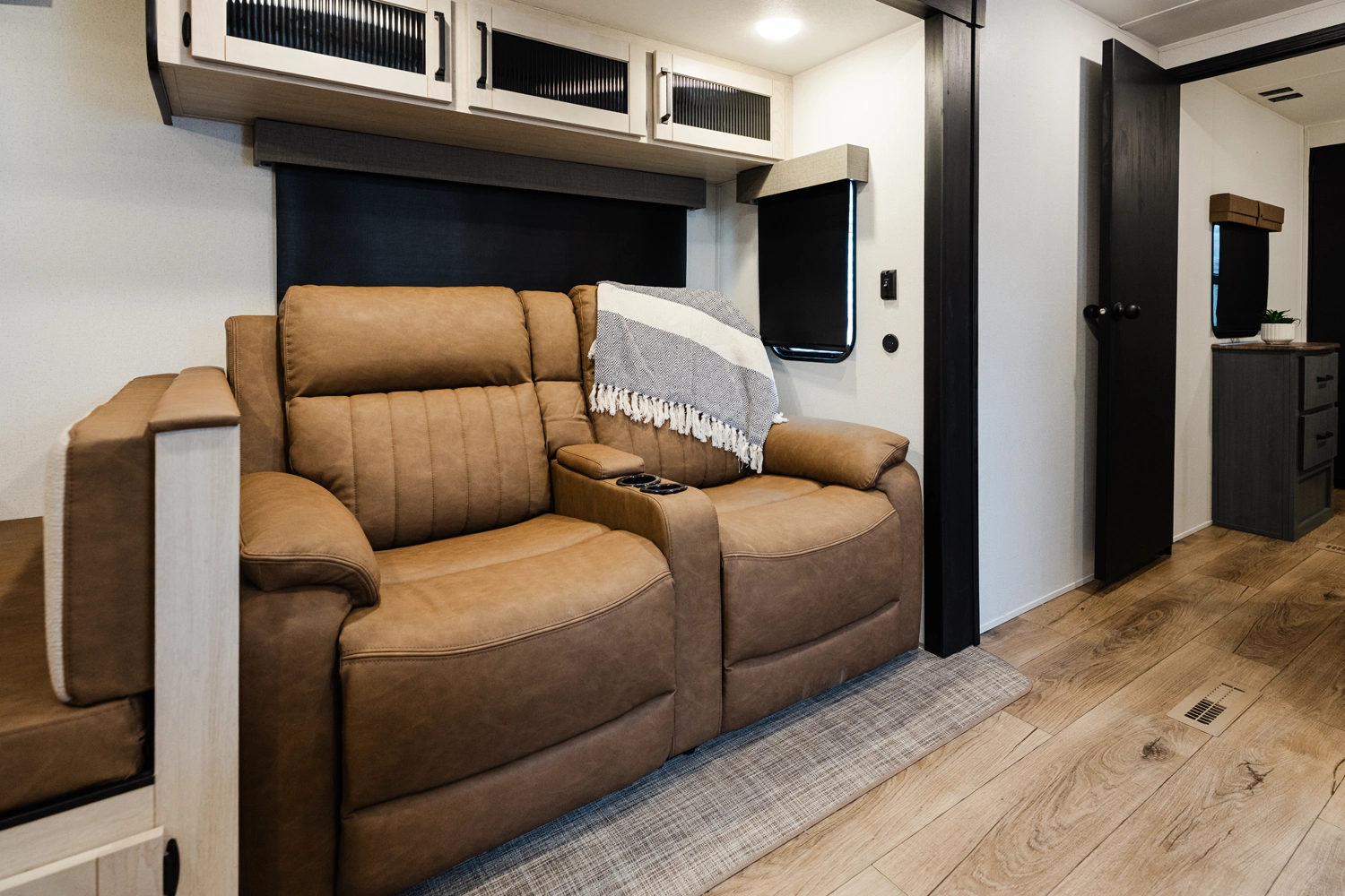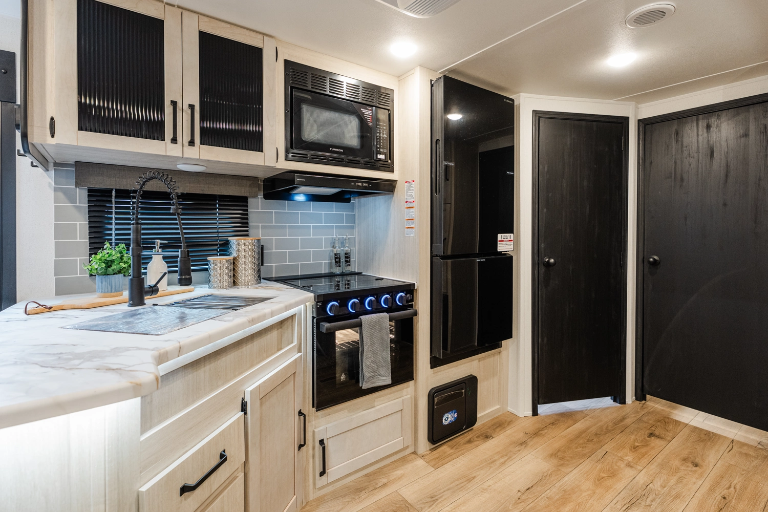 This bunk house travel trailer supplies you a great deal of space in the front bedroom. With a slide out and a large closet for all of your clothes, it will feel like your bedroom at home. The bunk house in the rear provides space for all guests to be comfortable and to make things a cut above, this floor plan provides two bathrooms. Furthermore, the exterior mini camp kitchen features a fridge and a griddle for those of you who like to cook in nature.