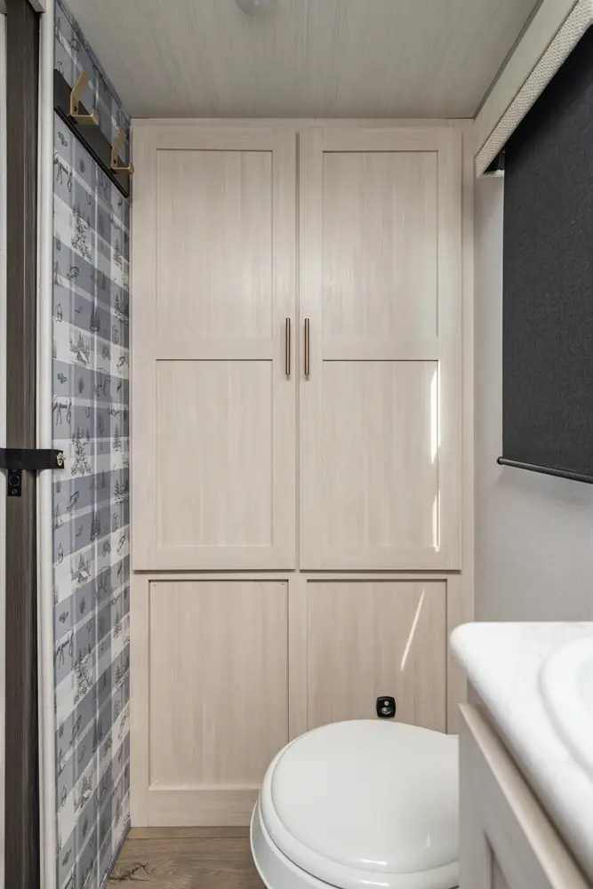 This 25' 8" ultra-lite travel trailer offers a spacious layout with a private front queen bed and a full rear bath. The well-equipped kitchen features a bar top with a flip-up window, convection microwave, and 12V refrigerator. Inside, enjoy 64" theater seating for relaxation. Exterior amenities include a 13' power awning and a hot & cold spray port, perfect for compact adventures.
