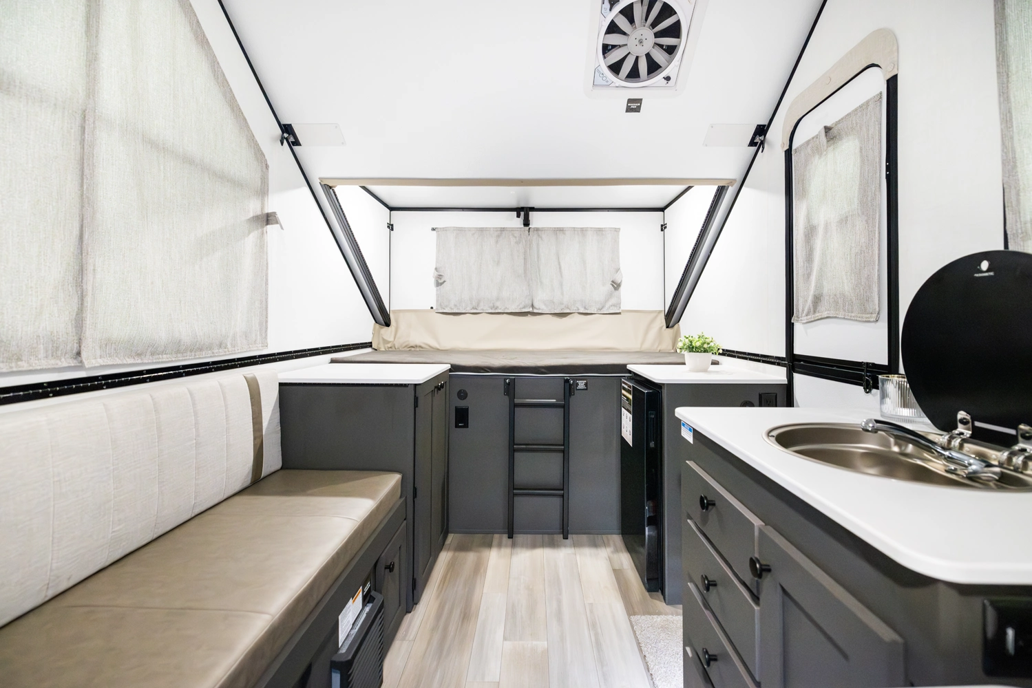 The Rockwood Hard Side A216HS combines compact convenience with smart design. Its front dormer increases headroom while housing a comfortable bunk bed, while the rear gaucho easily converts for relaxing or sleeping. Inside you’ll also find a convenient wet bath, a sink, and a small refrigerator—making this hard side camper a practical and comfortable choice for easy adventures.
