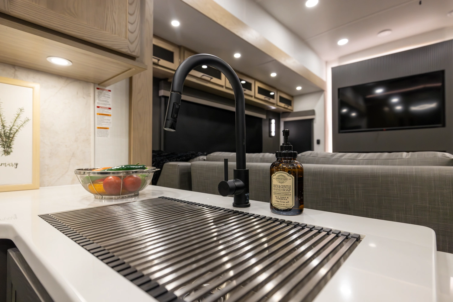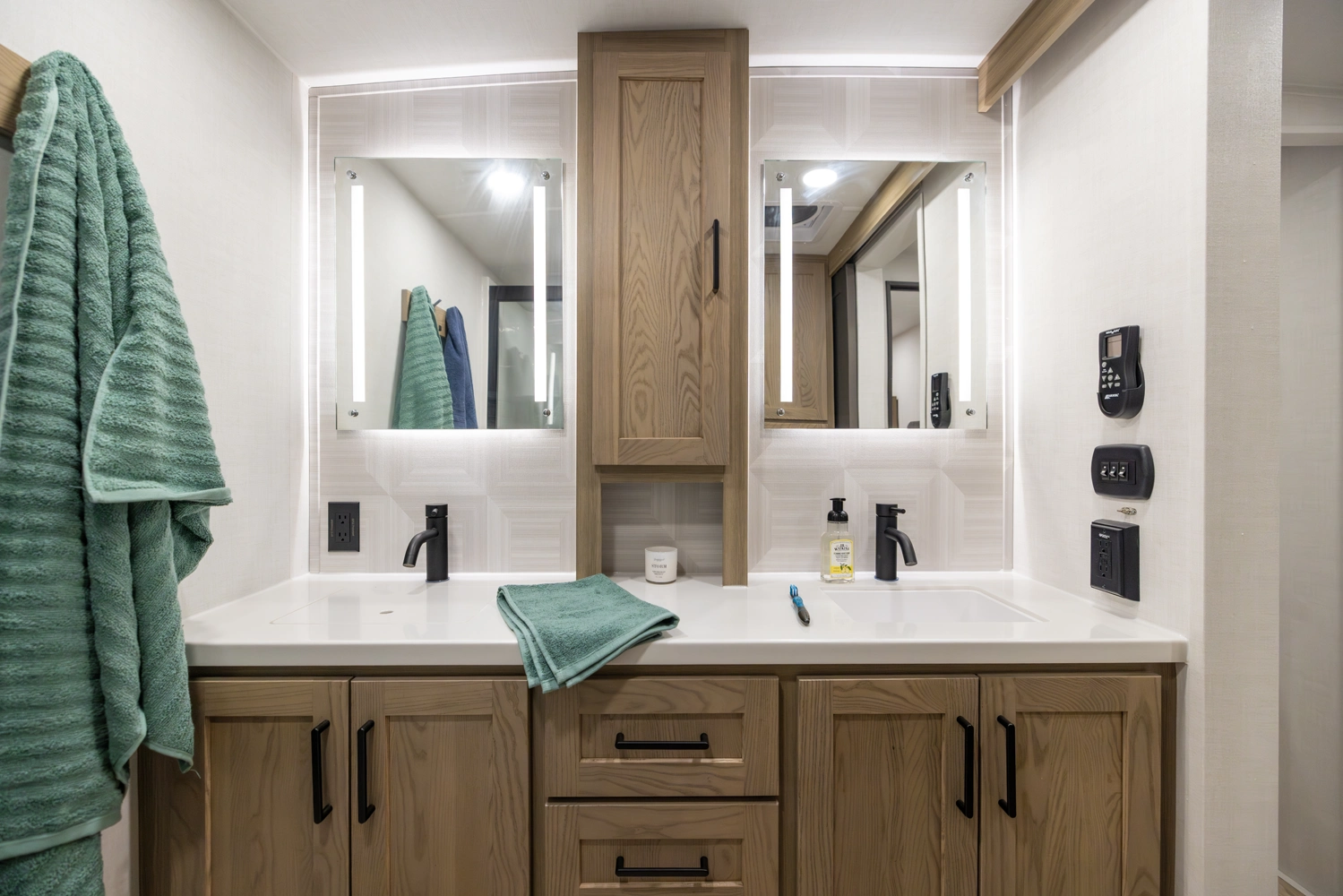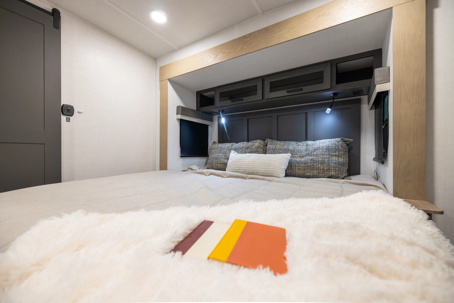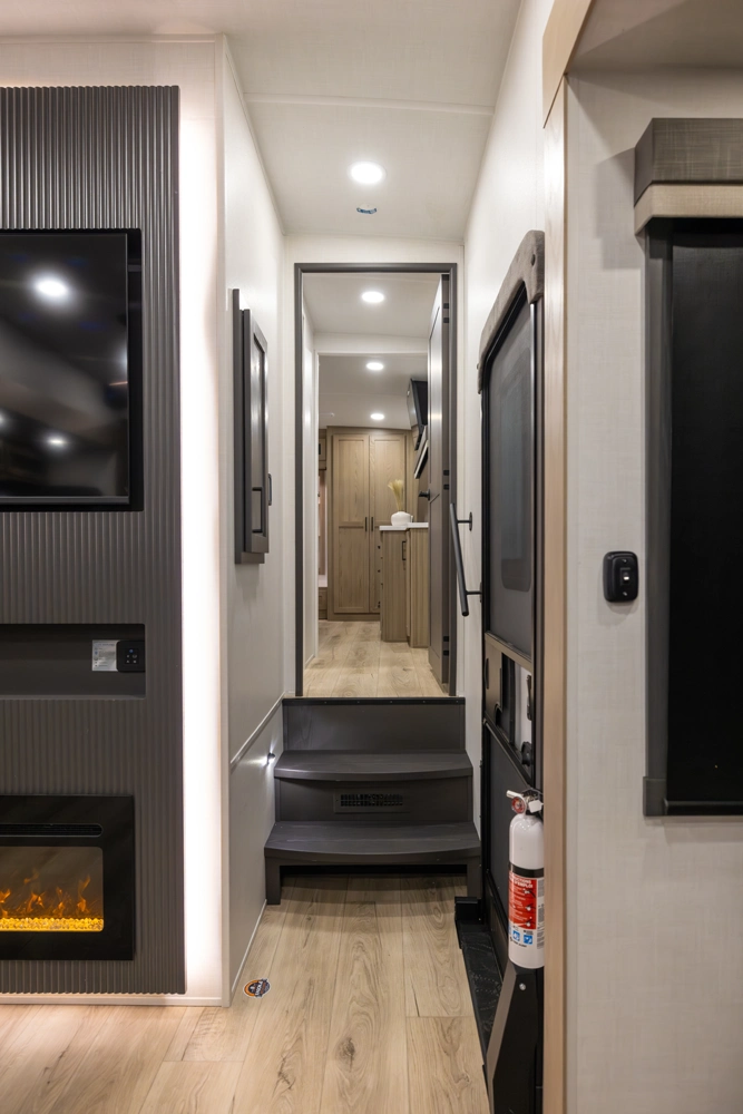 This 101" Wide Body fifth wheel is a rear kitchen layout features expansive counter space, residential style appliances, and abundant storage, making it ideal for those who love to cook while traveling. The mid living area features an L-shaped sofa with an integrated Hide-a-bed and 52" theater seat that requires no dismantling when the slides are retracted. Up front you have a private bedroom with a king bed and generous wardrobe space that is Washer/Dryer ready!