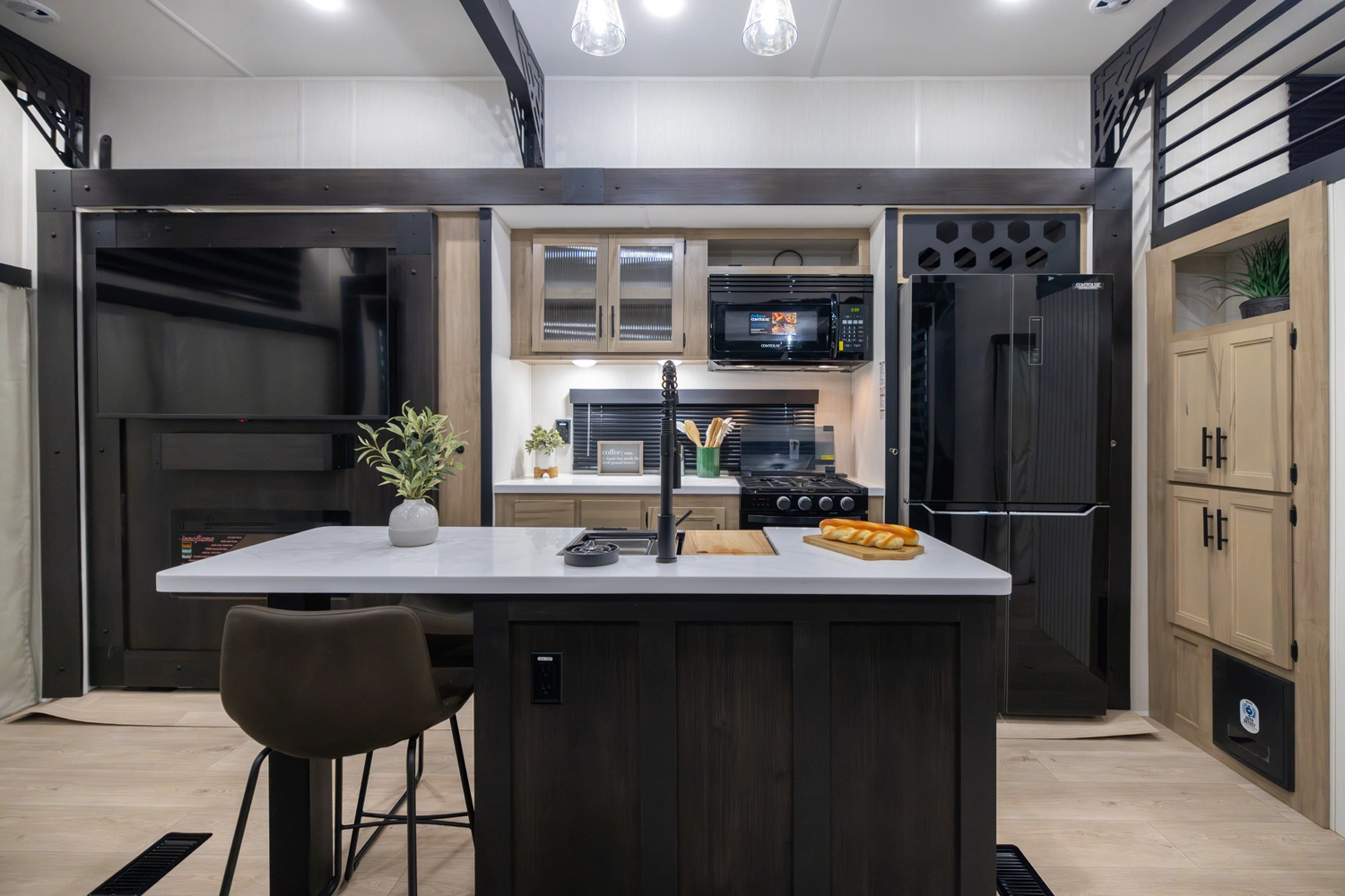 • Cherokee Black Label Timberwolf (Deep Tinted Frameless Automotive Glass Windows, High Gloss Gel Coat Exterior Sidewalls, Multicolor Reading Lights, Pillowtop Mattress Upgrade, Thermo Foil Arctic Insulation, Wall Controlled Power Shades for Living Room and Kitchen)