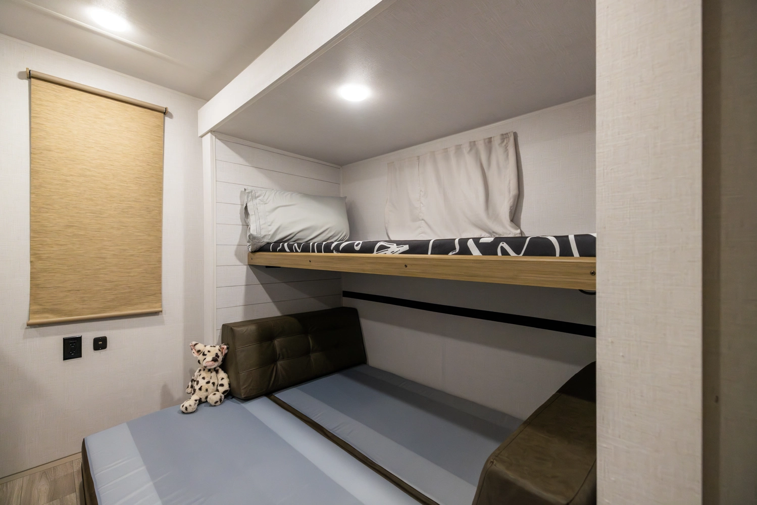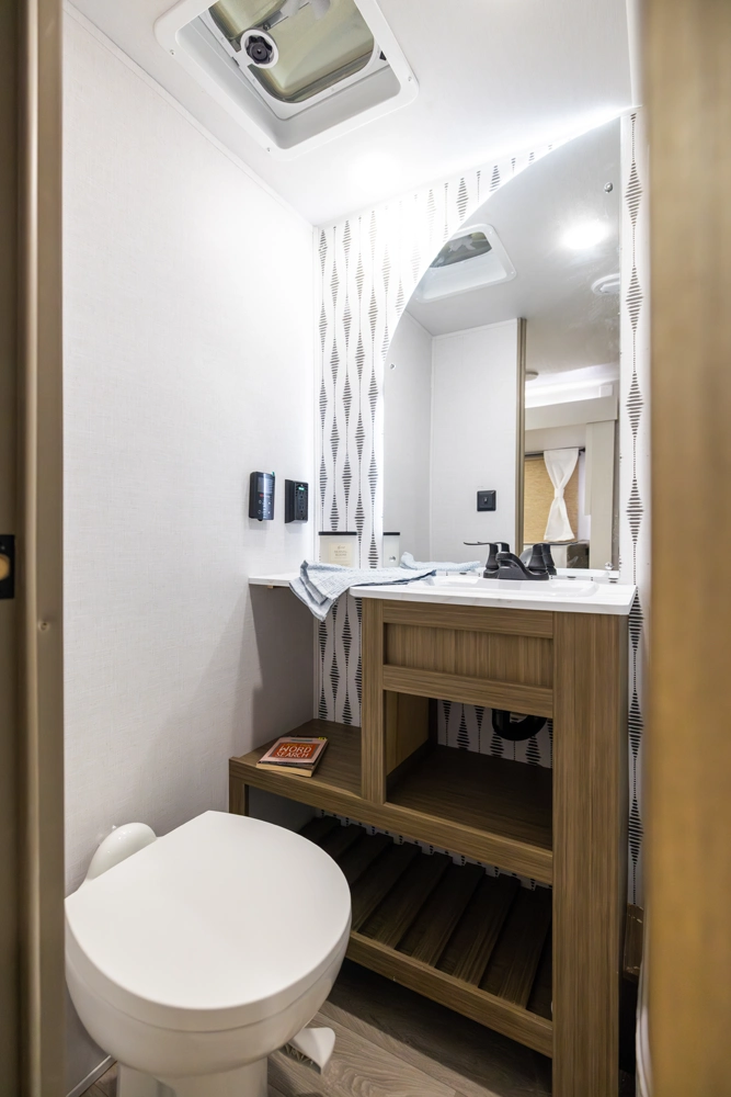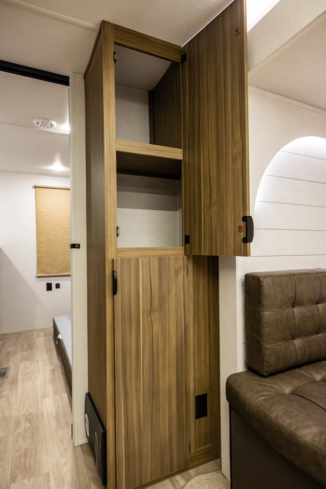 The 33TS is the ultimate bunkhouse, with three total slide outs and an outside kitchen. This well-equipped travel trailer features oversized panoramic windows and the desirable Versa-Lounge. The back-bunk room features the Versa-Queen giving this floorplan the option for two queen beds!